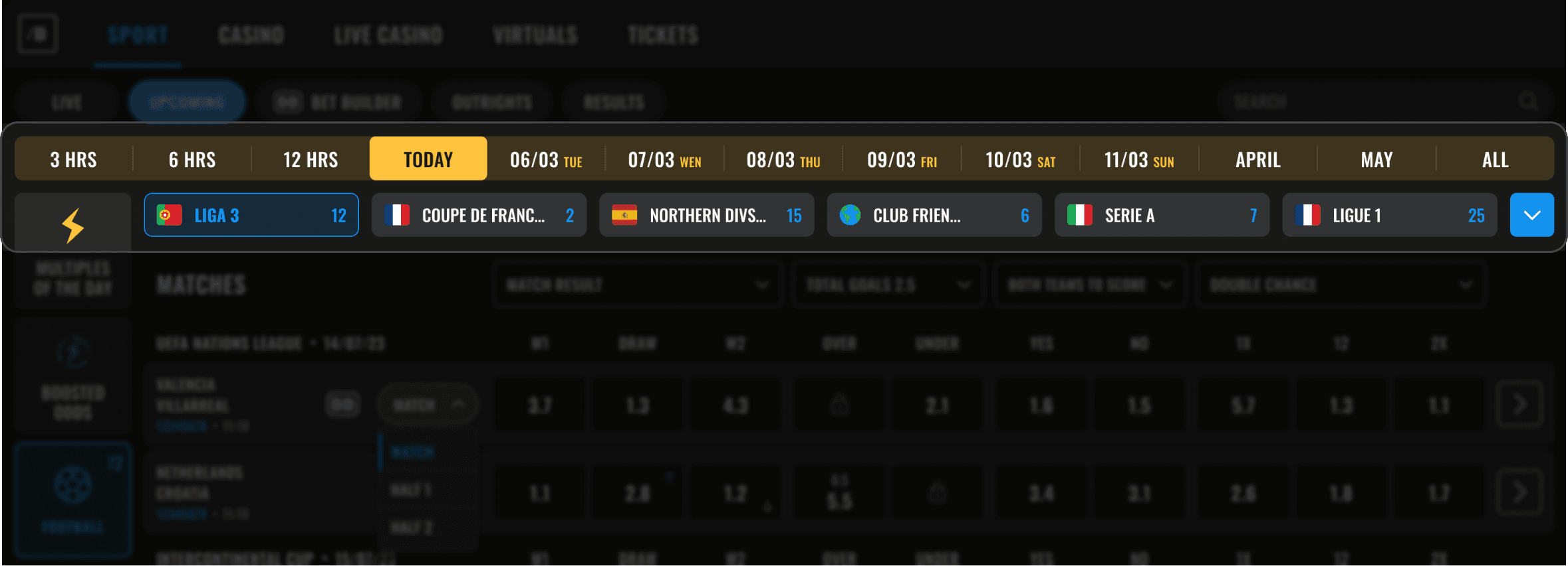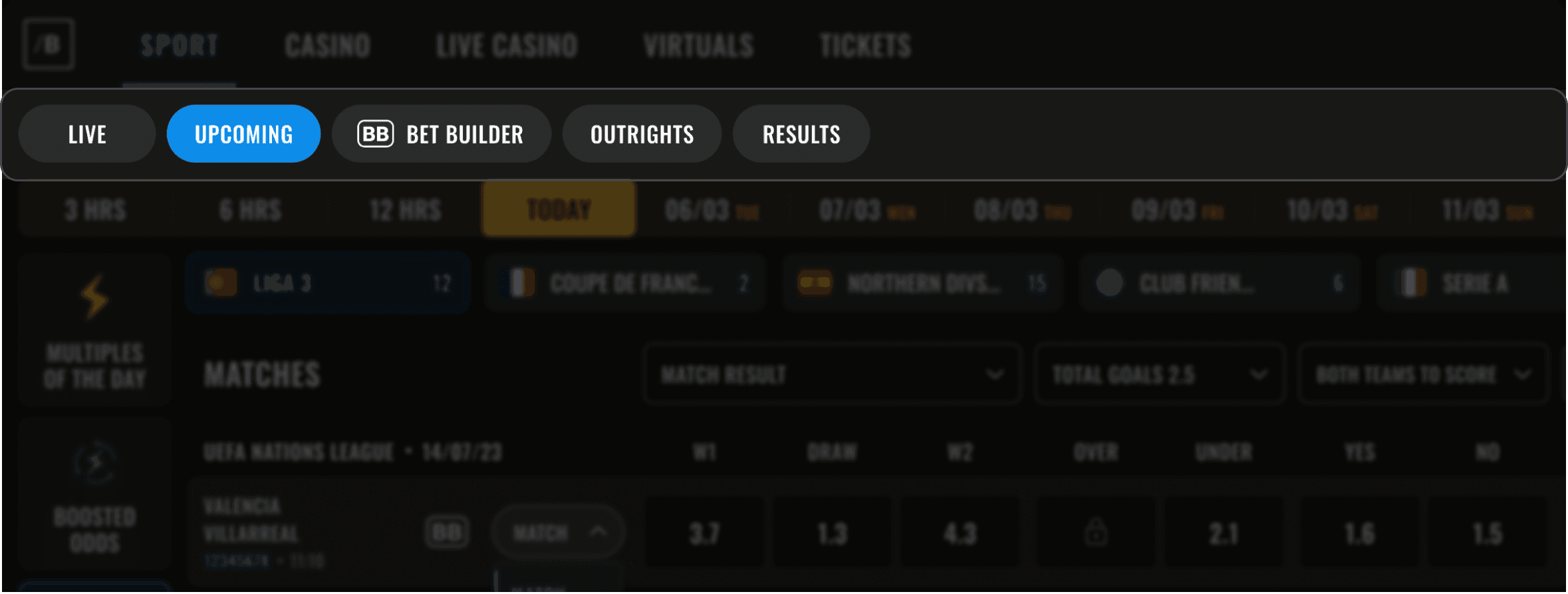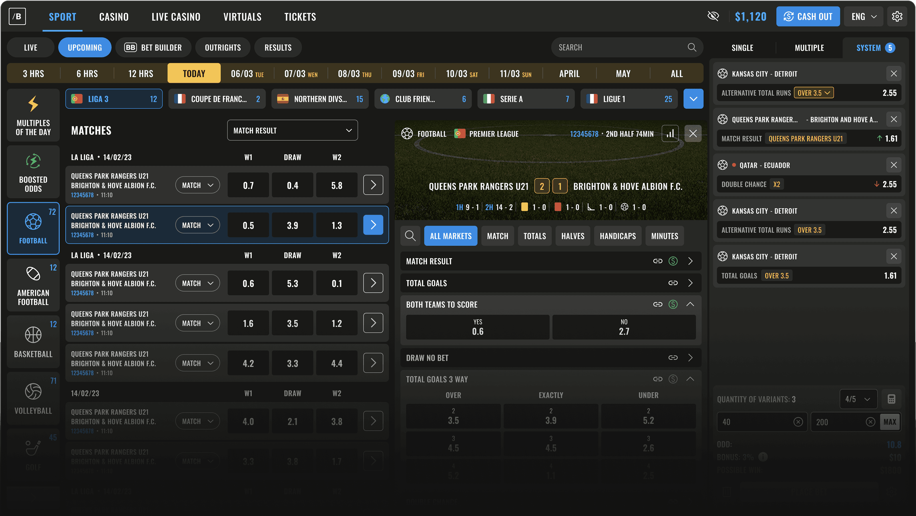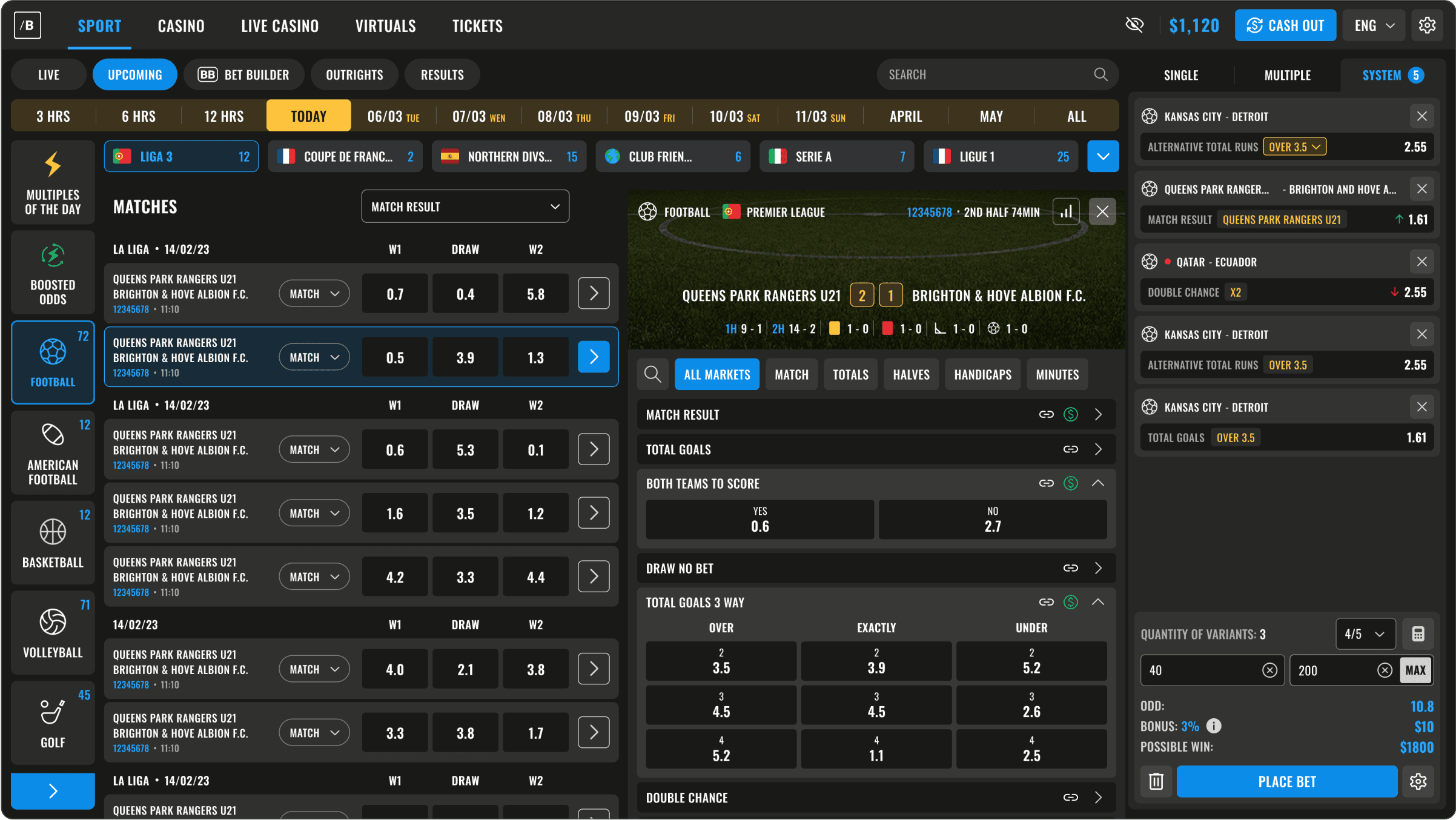 • Sport selection first, then guided bet-building